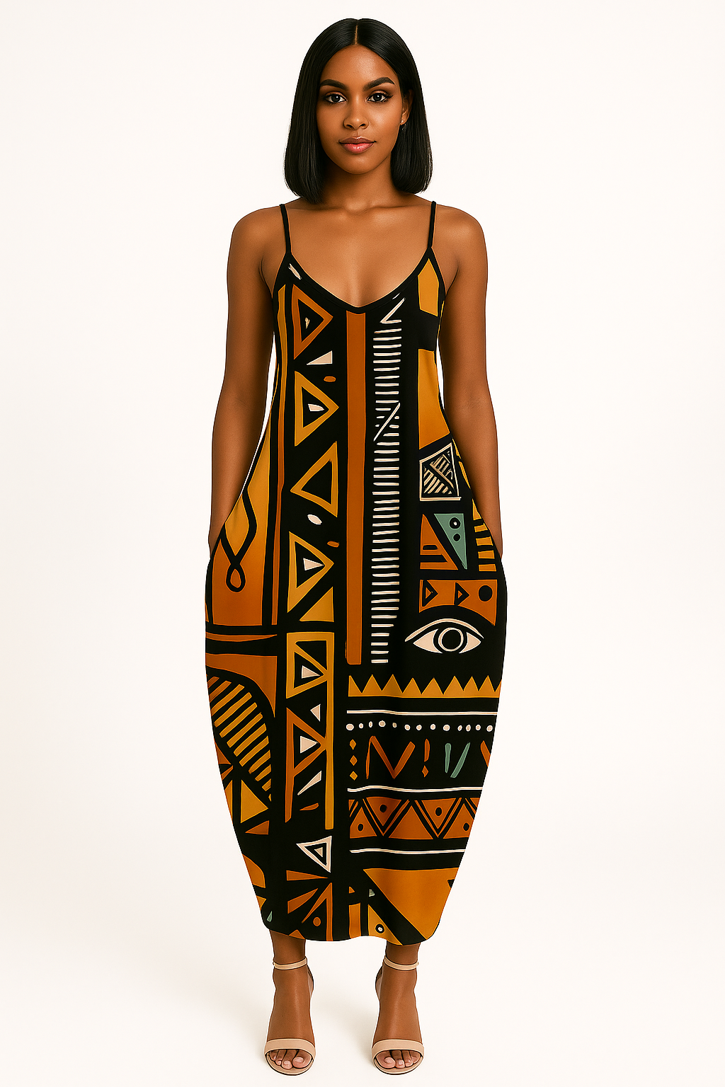 African Print Maxi Sun Dress - Sleeveless Adjustable Straps Dress with Pockets